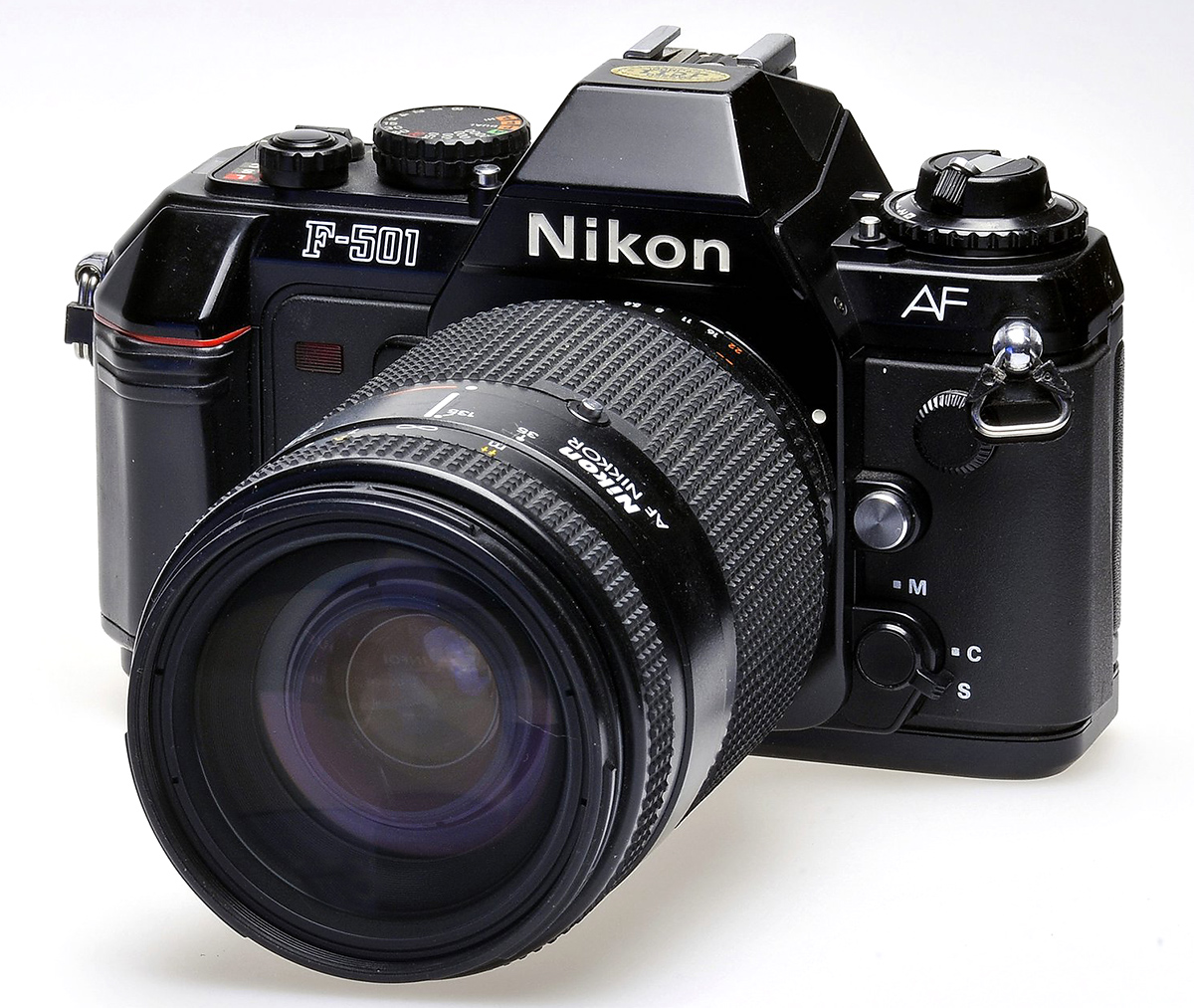 Nikon ni želel preveč zaostajati in so pohiteli s svojo AF kamero. Toda videlo se je, da niti v domeni sodobnega ohišja kot AF sistema, nimajo novih rešitev. V tistem trenutku je bilo pomembno, da ne zaostajajo preveč. Če je imel Canon podobno ali še bolj moderno ohišje kot Minolta, vendar z do takrat zgrešenim načinom prenosa AF, je Nikon sestavil nekaj že znanih elementov. Leta 1986 so predstavili AF kamero Nikon F-501. Posodobljen kontrastni sistem AF so prenesli iz F3-AF in ga dodali v svetlobni jašek, rešitev prenosa ostrenja s kardanskim prenosom pa posneli po Minolti. V že znano ohišje in tehniko kamere F-301 so dodali AF modul ter motorček, naredili nekaj AF objektivov s kardanskim prenosom in osrečili svoje uporabnike. Nikon se je kot edini držal tradicije in ohranil trdnost ohišja in objektivov, ter ju ni obdal s plastiko. Prav tako so nastavitveni gumbi ostali klasični in novodobnih elektronskih gumbov in LCD zaslona še ni bilo na vidiku. Vendar Minolta 7000 AF je bila že leto dni na trgu in v prodajnih rezultatih je tudi Nikon AF sistem ostal v ozadju. Kamera Minolta 7000 AF tako še vedno ni imela tekmice. Nikon je tako ali tako baziral na naprednih in PRO uporabnikih in za njih AF še ni bil uporaben.