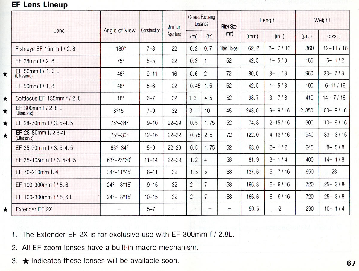 Ob prihodu kamer EOS 650 in EOS 620 je bilo na voljo osem objektivov. V navodilih kamere je bilo že najavljeno, da jih bo prišlo v nekaj mesecih na trg še pet. In glede na goriščnice, svetlobne moči, kakovosti ter še ne videne novosti (USM kaj bo to?), se je vedelo, da Canon misli resno. Nobeno drugo podjetje ob novih kamerah še ni predstavilo toliko AF objektivov.