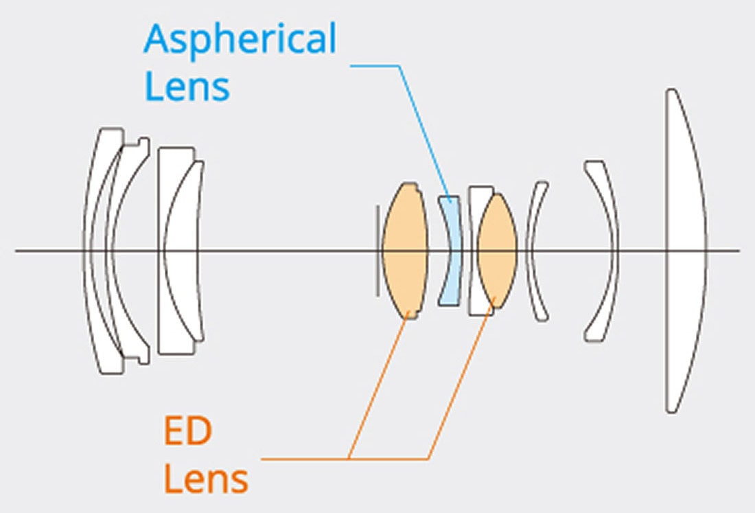 Zgradba objektiva 11 optičnih elementov v 9 skupinah