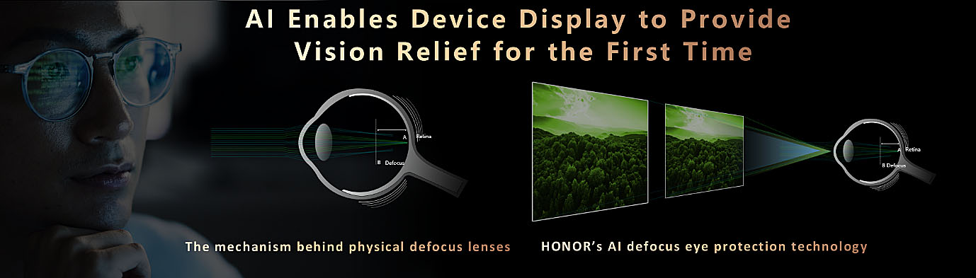 HONOR je na sejmu MWC v Šanghaju predstavil najnovejšo tehnologijo za zaščito oči AI Defocus Eye Protection. Zaradi globalnega porasta primerov kratkovidnosti, ki je posledica dolgotrajne uporabe zaslona, ta tehnologija uporablja umetno inteligenco za simulacijo očal za razostritev na zaslonu pametne naprave.