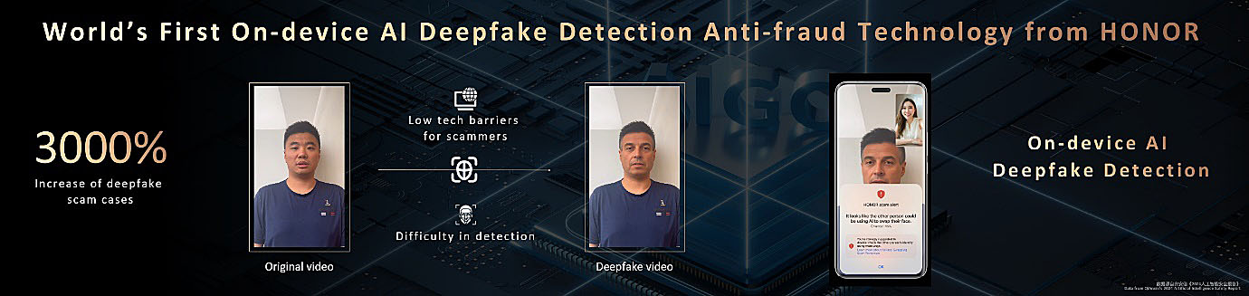 HONOR je obšel tveganja, ki jih predstavlja tehnologija umetne inteligence v oblaku, ki temelji na "deepfake", in predstavil tehnologijo AI Deepfake Detection. Da bi preprečil goljufije in odkril digitalno manipulirano vsebino, AI Deepfake Detection preučuje informacije po posameznih sličicah, kot so očesni stik, osvetlitev, jasnost slike in predvajanje videoposnetka, ter tako prepozna napake, ki jih človeške oči ne opazijo.