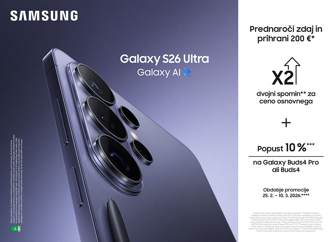 Če kaj ceni vsak fotograf in ustvarjalec video vsebin, je to prostor za shranjevanje. Samsung je ob prihodu nove serije pripravil prednaročniško ponudbo. Med 25. februarjem in 11. marcem 2026 lahko kupci podvojijo prostor za shranjevanje in prihranijo do 200 €. Ob prednaročilu se shramba samodejno nadgradi na naslednjo stopnjo, kar pomeni, da model s 256 GB postane 512 GB brez doplačila. To je dobrodošla prednost za vse, ki snemajo v visoki ločljivosti, uporabljajo APV ali pogosto fotografirajo v RAW formatu.