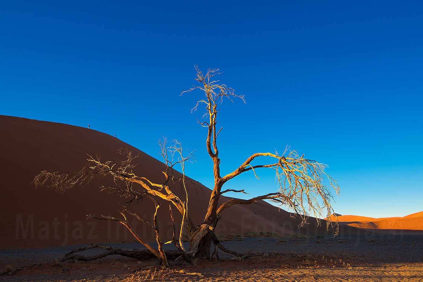 Sonce se je dvignilo nad peščino. Topla svetloba se je razlila po njej, suho drevo je ustvarilo temne, dolge sence. Za poudarjen prednji plan sem poprosil dekleta, da mi zapolnijo kader. Močna zunanja bliskavica je bila postavljena pred njih in prožena brezžično.