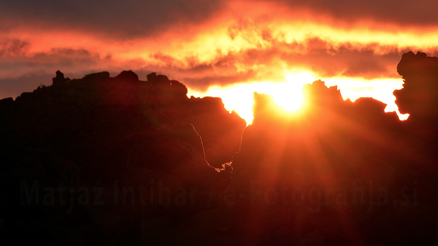 Canon EOS 5D MkIII, EF 24-70mm f/2.8, 1/30sek., f/4, ISO 800, (iz roke) Sonce je oddalo prve žarke na pokrajino in povsem pordečilo vulkanske skale. Verjemite, ob sončnih vzhodih zna biti res hladno. Ne pozabite na toplo oblačilo.