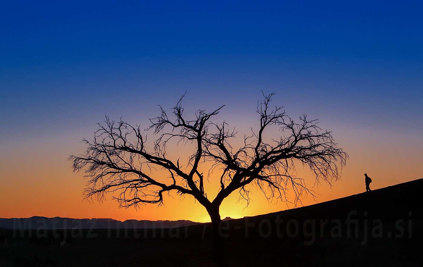 Tokrat so v prednjem planu stopinje v pesku, ki peljejo k drevesu. V zadnjem planu pa sipina in turisti, ki gredo na njo počakat vzhod.