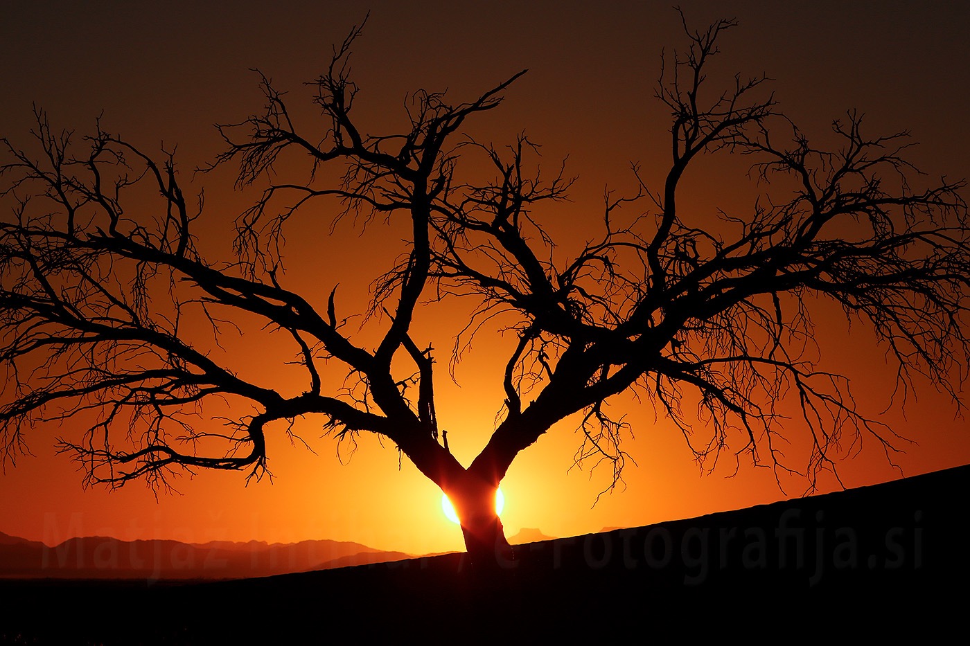 Kot že povedano. Silhueta nam mora odkriti, kaj je naš skriti del motiva. Prvi žarki se že kažejo nad sipino, niso pa še dovolj visoko, da bi osvetljevali njen breg. Oseba na vrhu je zaradi močne direktne svetlobe v lepem siju in tako je kljub majhnosti silhueta prepoznavna. Prav tako so dovolj opazna debla mrtvih suhih dreves.