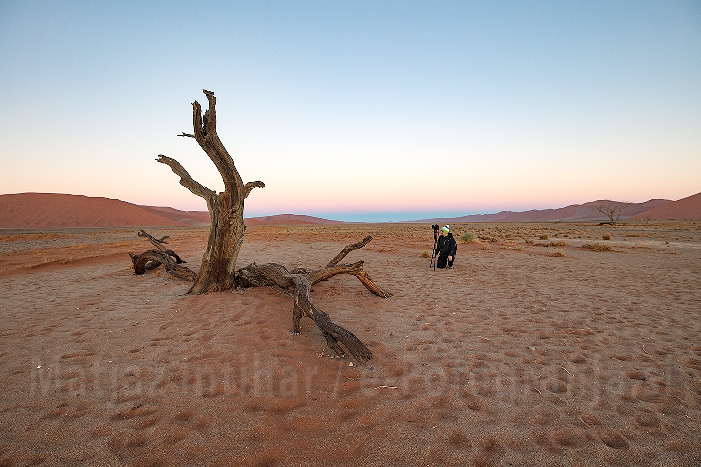 V zgornjem delu članka sem že objavil isti motiv s fotografom, vendar posnet pri goriščnici 30mm. Sonce je še za obzorjem, fotografiramo proti zahodu. Tu sem uporabil 15mm, v prednjem delu sliko utrjuje pesek, na levo sem uokviril večje suho drevo, fotograf in drevo v ozadju pa lepo dopolnjujeta diagonalo. Nežna svetloba sliko umiri in prikaže jutranji mir in čakanje na "zlato svetlobo"! Ekstremni široki kot oddaljujoče predmete vse bolj pomanjšuje. Če imamo nekaj zanimivih delov motiva, potem s pomočjo pomanjšujoče perspektive ustvarimo globino.