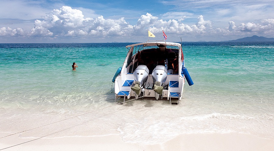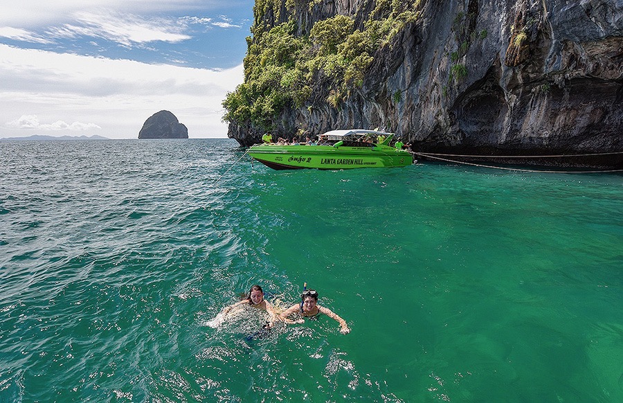 Gremo s hitrimi čolni na otoke Phi Phi, Koh Kradan in plavamo skozi jamo, ki jo je v apnenec izdolbel morje. Plavamo v temi jame Emerald. Ko pridemo zopet na svetlo, smo na peščeni laguni, okoli nas pa jašek, kot bi stali v vulkanu. Posebno nepozabno doživetje.
