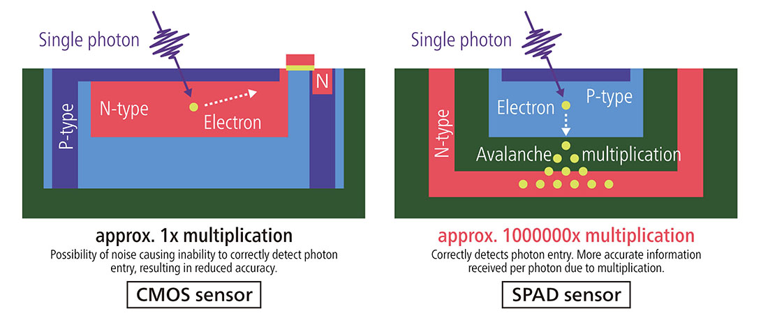 Izraz "slikovno tipalo" spominja na tipala CMOS v digitalnih fotokamerah, vendar tipala SPAD delujejo na drugačennačin. Tipala izkoriščajo dejstvo, da je svetloba sestavljena iz delcev. Vendar pri tipalihih CMOS vsaka točka meri količino svetlobe, ki jo doseže v danem času, medtem ko tipala SPAD merijo vsak svetlobni delec (tj. foton), ki doseže točko. Vsak foton, ki vstopi v slikovno točko, se takoj pretvori v električni naboj, elektroni, ki nastanejo, pa se sčasoma pomnožijo kot plaz, dokler ne tvorijo močnega signalnega naboja, ki ga je mogoče izločiti. Obenem tipala SPAD digitalno štejejo posamezne fotonske delce, kar oteži pridelavo elektronskega šuma. Tako si lahko tudi videoposnetek slabo osvetljenih okolij ogledamo, kot da bi ga gledali s prostim očesom v dobro osvetljenem okolju.