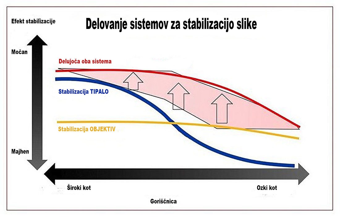 Najboljši stabilizacijski učinek dosežemo z usklajenim delovanjem obeh sistemov (rdeča krivulja). Pri širokokotnih objektivih ima večji vpliv stabilizacija s premikom tipala, pri telefoto objektivih pa optična stabilizacija. Ko obe tehnologiji sodelujeta, zagotavljata optimalno zmanjšanje tresenja pri vseh goriščnih razdaljah.