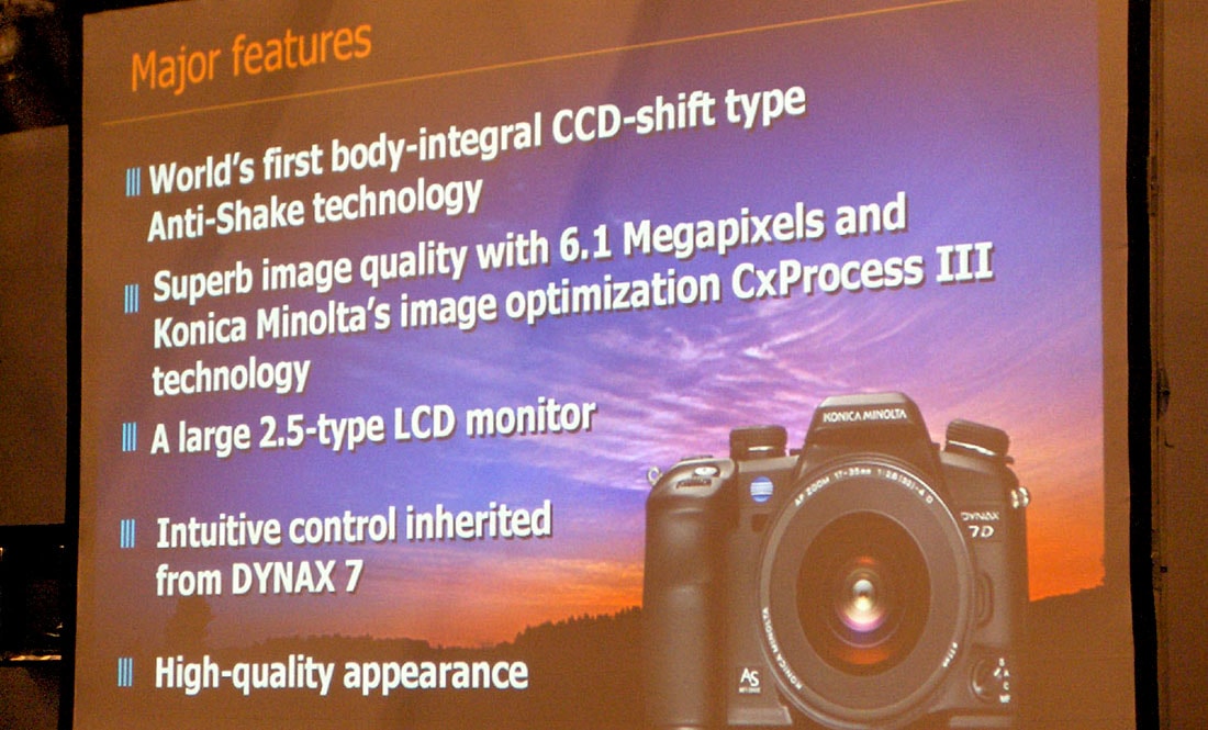 Leto kasneje je Minolta predstavila prvo DSLR kamero z vgrajenim IBIS, model Dynax 7D, ki je funkcionalnost stabilizacije prenesla v sistem izmenljivih objektivov. Sam sem imel priložnost na Photokini 2004, preizkusiti ta sistem in bil sem navdušen nad njegovo učinkovitostjo. Tipalo APS-C v kameri Dynax 7D se je premikalo diagonalno za kar 9 mm, kar je za tisti čas predstavljalo tehnološki presežek in izjemno natančnost delovanja.