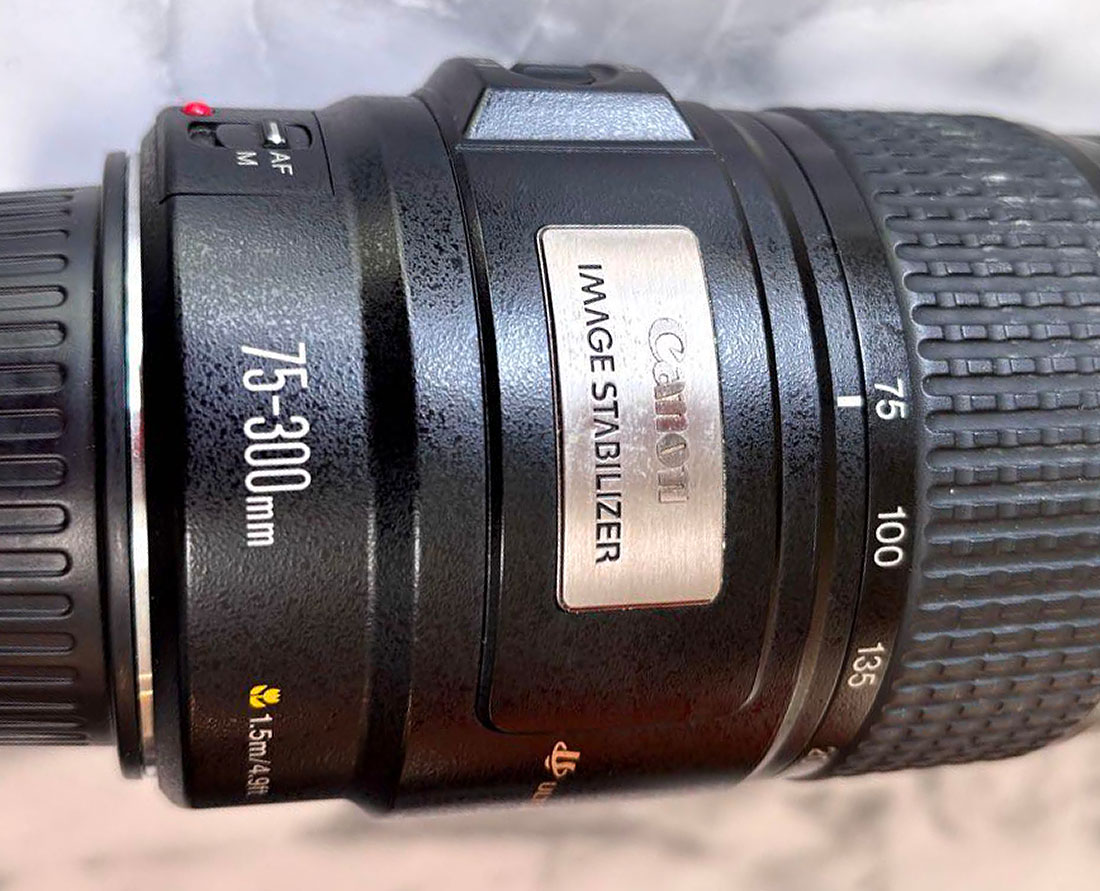 Canon je leta 1995 predstavil prvi objektiv z vgrajeno optično stabilizacijo slike, model EF 75-300mm f/4-5.6 IS USM. Sistem je s pomočjo žiroskopskih tipal zaznaval premike kamere in premikal posebni sklop leč znotraj objektiva, da bi zmanjšal vpliv tresljajev na končno sliko. V kombinaciji s sistemom hitrega ostrenja USM (Ultrasonic Motor), ki ga je Canon predstavil že leta 1987, je IS tehnologija vgrajena v L objektive, povsem spremenila svet športne in reporterske fotografije.