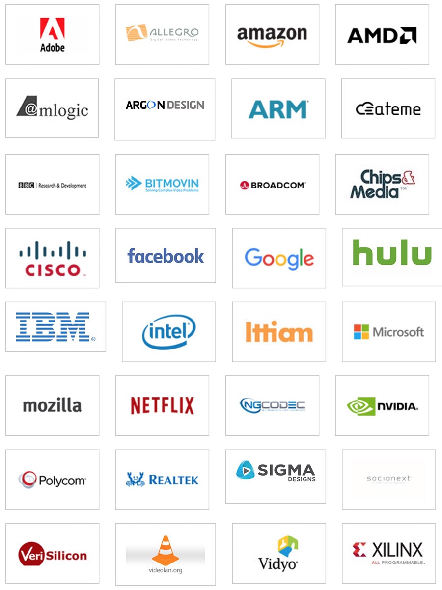 Glede na to, da so v združenju Adobe, Amazon, Apple (še ni dodan na sliki ker se je priključil pred kratkim), Facebook, Google, IBM, Intel, Microsoft, Mozilla, Netflix, Nvidia, YouTube..., se bo nov format lahko zelo hitro implementiral v današnje najbolj uporabljene naprave in spletne medije.