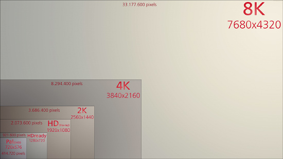 Če so nas ločljivosti do 800x600 (SVGA) točk v računalniški tehnologiji spremljale desetletja in nato ločljivosti do 1280x800 (1K / SXGA) deset let, vse do prihoda ločljivosti 1920x1080 (2K / Full HD), smo v zadnjih nekaj letih spoznali in že dobili še višje ločljivosti. 4K TV (4096x2160) je že standard, enako projektorji in večji računalniški zasloni.