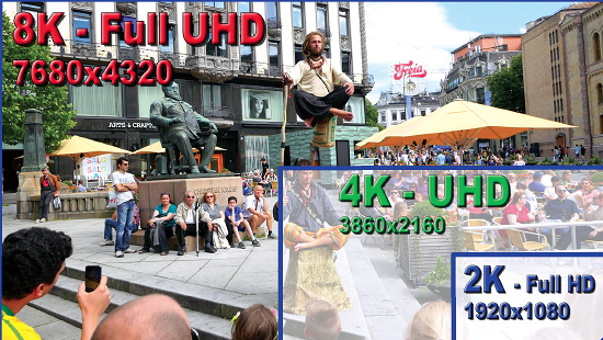 Tu je prihodnost. Medtem, ko tudi v hobi video vstopa UHD (4K) zapis, poznamo že od leta 1995 v eksperimentalni fazi Full Ultra HD (kodni naziv Super Hi-Vision) ločljivost 8192x4320 točk. Japonski TV gigant NHK je takrat začel razvijati ta visokoločljivi format in za razvoj porabil več kot milijardo dolarjev. 8K ločljivost (33M točk), ki jo danes v fotokamerah dosegajo le redke, naj bi v domove prišla v roku petih let. Kar pomeni. Da bodo naše današnje fotografije z manj kot 35M točk enostavno manjše od zaslona v 1:1 povečavi. Prenos 8K zapisa so testirali že na olimpijskih igrah v Londonu (2012) in isto leto na festivalu v Kanu, kjer so že prikazali 27 minut dolg film na 220 stopinjskem zaslonu. Tudi YouTube že omogoča dodajanje 8K videa.