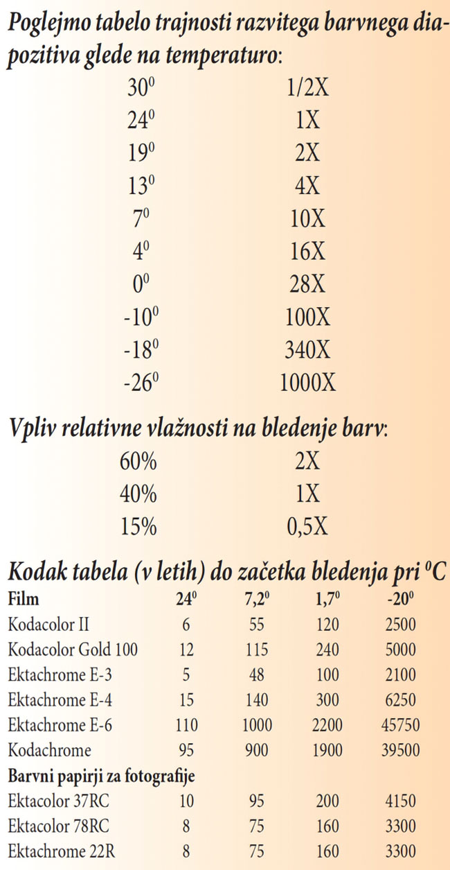 Na enem izmed seminarjev, namenjenih strokovnjakom za arhiviranje umetniških slik, fotografij in glasbe, sem si dobro zapomnil nasvete glede arhiviranja diapozitivov. Vsi, ki smo resno uporabljali diapozitivne filme, smo ob nakupu dobro pogledali rok trajanja (da, film ga je imel), in nekaj povsem samoumevnega je bilo, da smo filme kupovali tam, kjer so jih hranili v hladilnikih. Marsikateri novodobni fotograf se bo nasmejal ob teh zapisih. Toda tako je bilo in tudi doma smo tako negativne kot diapozitivne filme, ki jih nismo potrebovali, spet dali v hladilno skrinjo in jih šele dan pred fotografiranjem dali na sobno temperaturo. Kdor je dobro pazil na filme in imel dobrega laboranta za razvijanje, je lahko vedno bil zadovoljen tudi z materialom in s slikami. Kdor ni pazil na rok trajanja diapozitivnega filma in ga je izpostavljal toploti ter ga ni takoj po fotografiranju oddal v razvijanje, ni mogel pričakovati dobrih rezultatov. Ali je imel film barvni »štih« (ton določene barve), ali je bila osnovna počrnitev filma (prosojni del) že opazno obarvana, ali pa so se barvila na neustrezen način združevala, zaradi česar so bile barvne vrednosti nepravilne. Torej predvsem na diapozitivnih filmih smo že ob nakupu in hranjenju filma pred fotografiranjem naredili malo doktorsko disertacijo. Pa ni bilo tako zapleteno. Celoten postopek je bil za naprednega fotografa nekaj samoumevnega. Tako je pač moralo biti in to smo upoštevali. Vendar pa so se po razvijanju filma le zelo redki fotografi zavedali, da je treba za dolgoročno arhiviranje prav tako poskrbeti za film in ga zamrzniti. Da, zamrzniti!