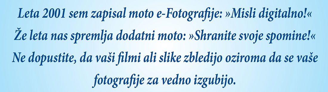 V zadnjih treh letnikih revije e-Fotografija sem v štirih člankih "Izdelajte si fotografije" vedno opozarjal, da ne izgubite spominov. Najboljše fotografije, zajete z digitalno fotokamero, izpišite na papir, da ne bodo za večno izgubljene ostale na trdih diskih računalnikov.